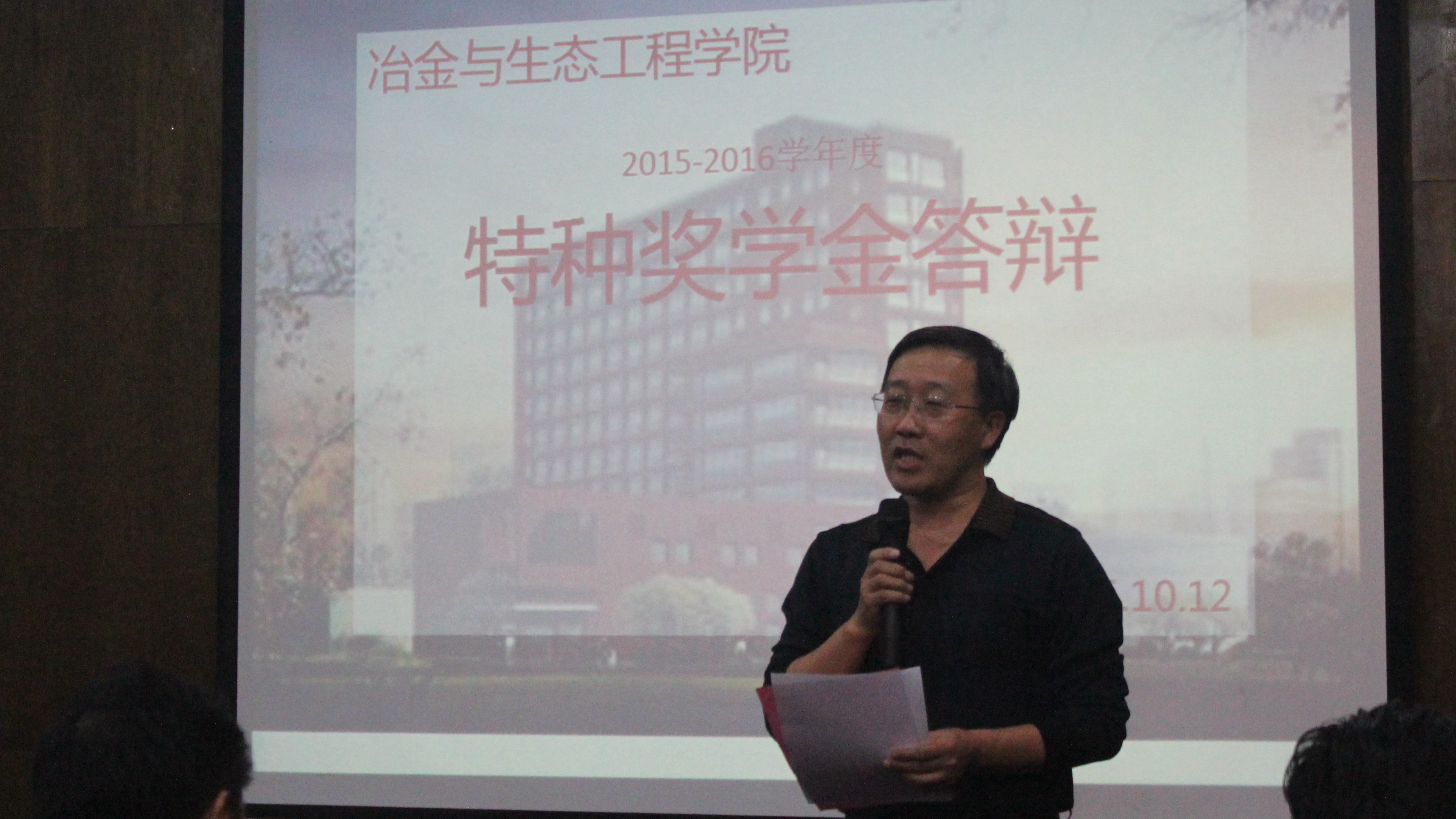 10月12日晚,成人文学 2014-2015学年本科生特种奖学金答辩会在冶金生态楼青钢报告厅隆重举行。来自本科2012、2013和2014级的12名优秀学子进行特种奖学金答辩。学院党委副书记兼副院长王春义老师、冶金1307班班导师马瑞新老师、冶金1407班班导师曹战民老师、钢铁冶金系王广伟老师、学院团委书记杨志伟老师及本科各年级辅导员担任答辩评委。本科2015级百余名学生现场观摩了答辩。