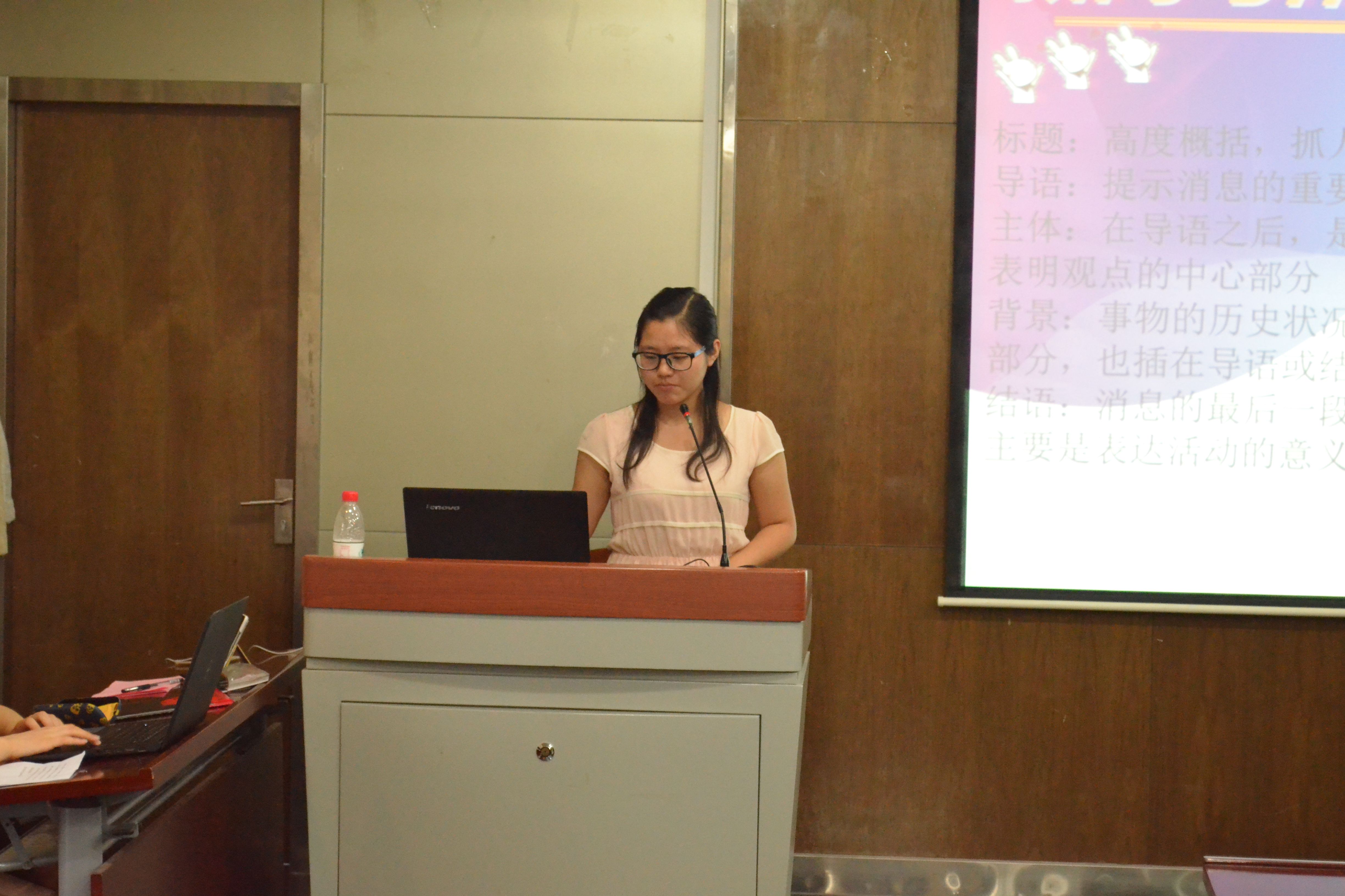 首先,成人文学副主任王春阳以“新闻的创作”为主题,从新闻稿的写作、活动照片的拍摄以及新闻稿的上传机制三方面进行了详细的解读。在强调新闻稿的准确性、时效性与真实性以外,她指出,要想写出一篇高质量的新闻稿,写好第一段是关键,倒金字塔式的内容堆叠会使整篇文章看起来更加层次分明,结尾处活动意义的总结则要言简意赅,突出重点。