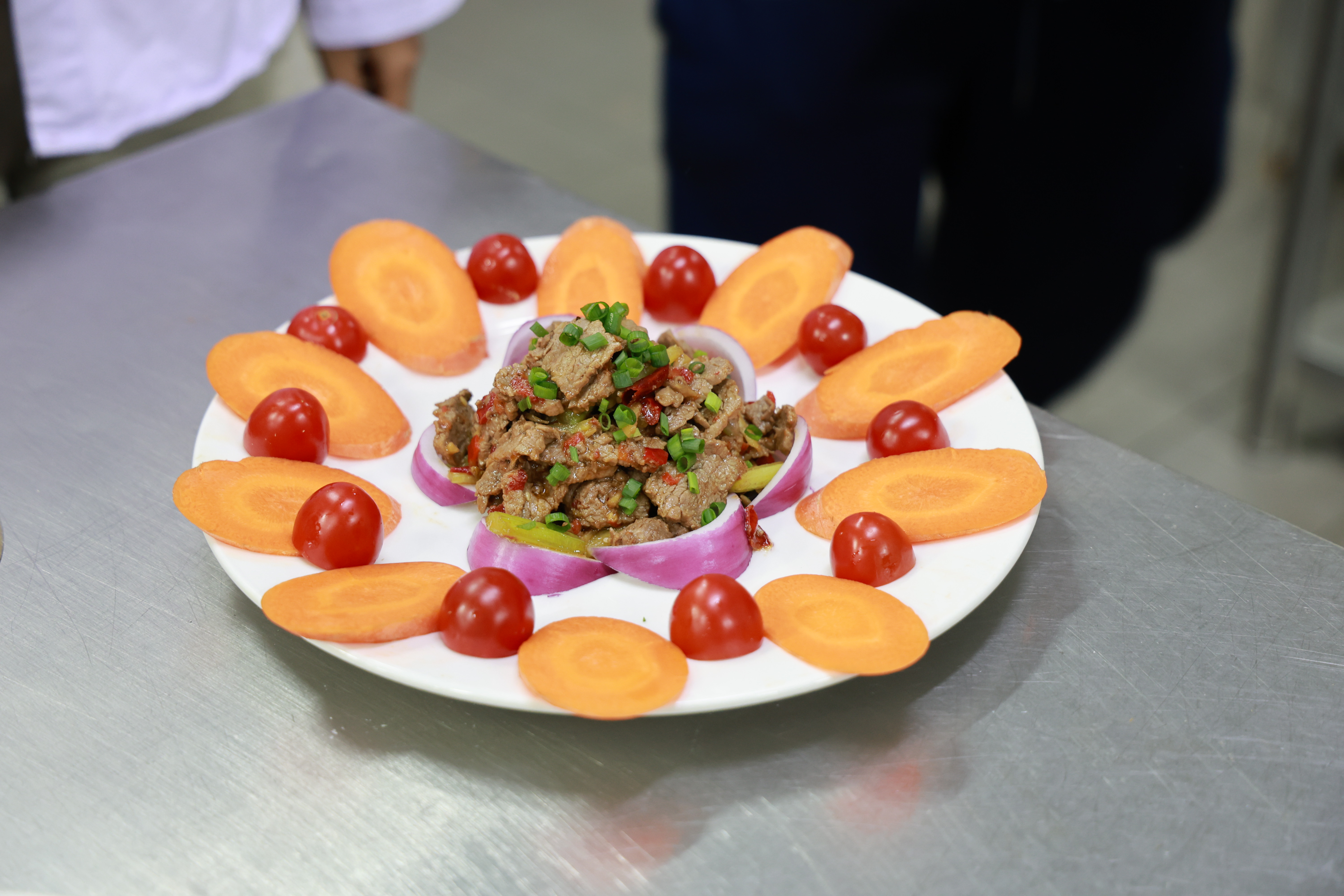 19:10比赛正式启幕,参赛队伍迅速进入状态,在50分钟内完成清洗、切配、烹饪、摆盘全流程。