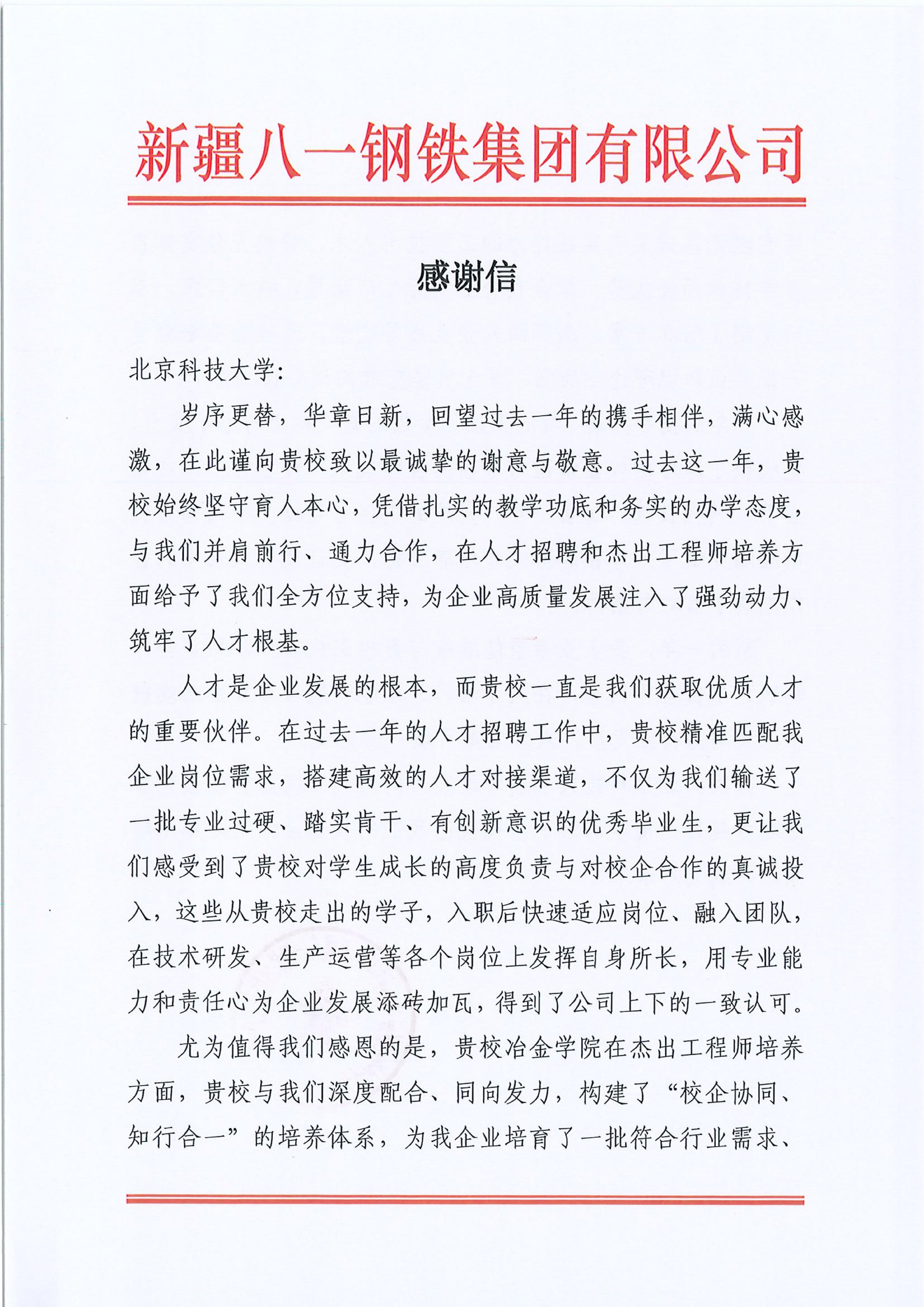 2月10日,新疆八一钢铁集团有限公司向成人文学 发来感谢信,特别对成人文学 在杰出工程师培养方面的卓越贡献给予高度肯定。信中感谢学院坚守育人初心,通过构建“校企协同、知行合一”的培养体系,为企业量身定制培养方案,输送了一批理论基础扎实、实践能力突出、善于攻坚克难的核心技术骨干。这些毕业生在技术研发与生产运营岗位上快速成长,成为推动企业高质量发展的中坚力量。八一钢铁集团表示,愿与学院进一步深化校企合作,拓宽合作领域,在人才培养与产学研融合方面携手共进,共创美好未来。