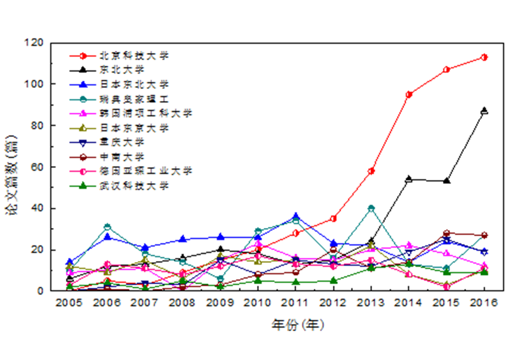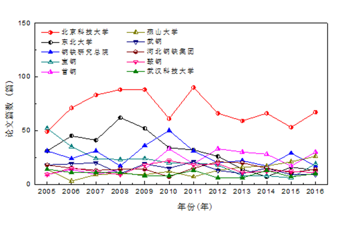 统计,2005―2016年,在钢铁冶金学科国内三大期刊《钢铁》、《炼铁》、《炼钢》上发表的文章,第一作者单位为成人文学