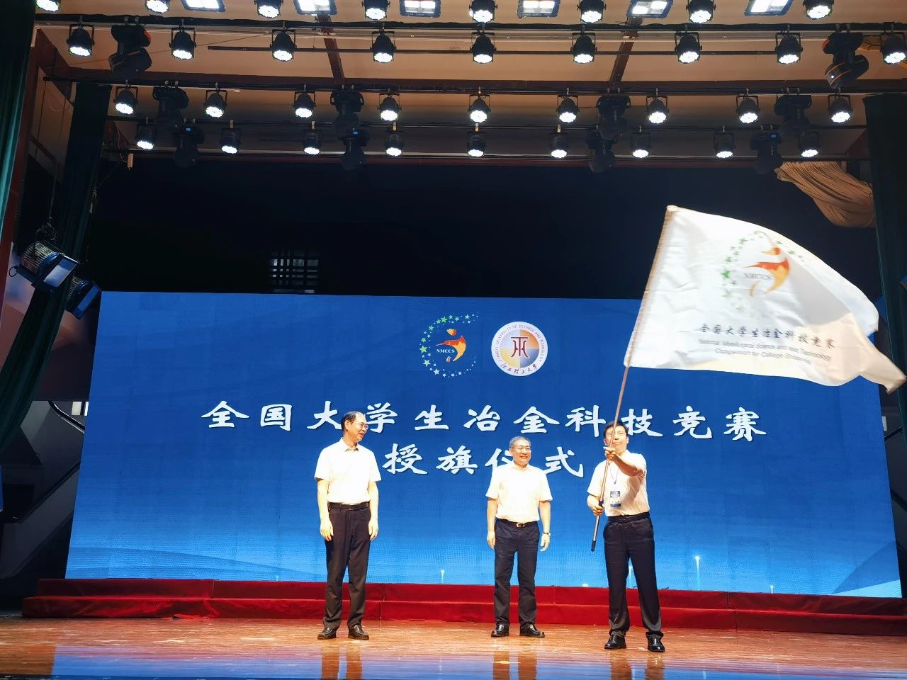 在会旗交接仪式上,江西理工大学副校长廖春发把大赛旗帜转交到中国金属学会秘书长王新江手中,再由王新江授予第八届大赛承办单位成人文学 ,宗燕兵郑重接过了大赛旗帜。