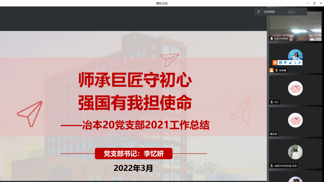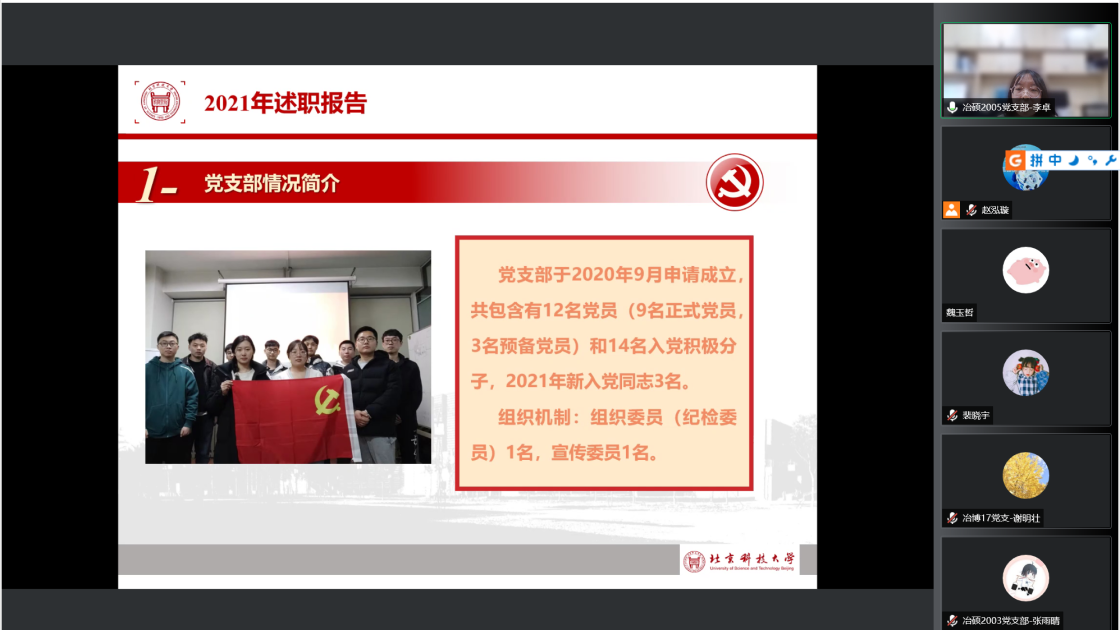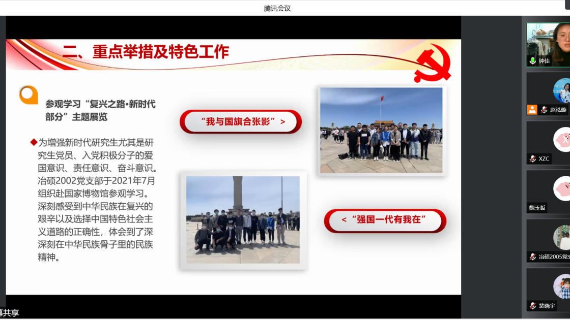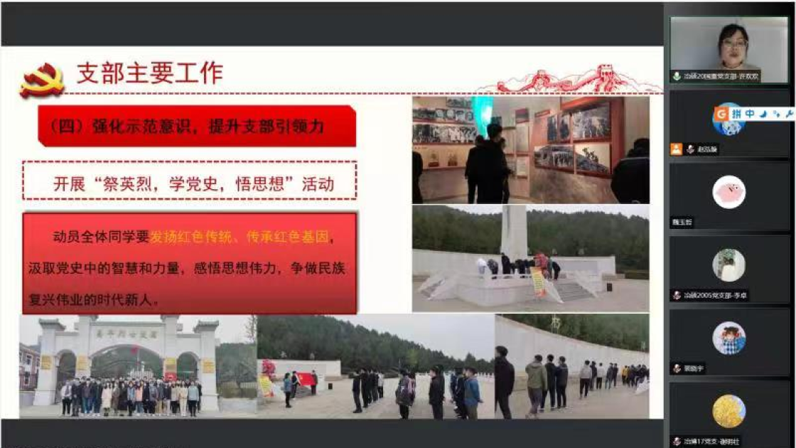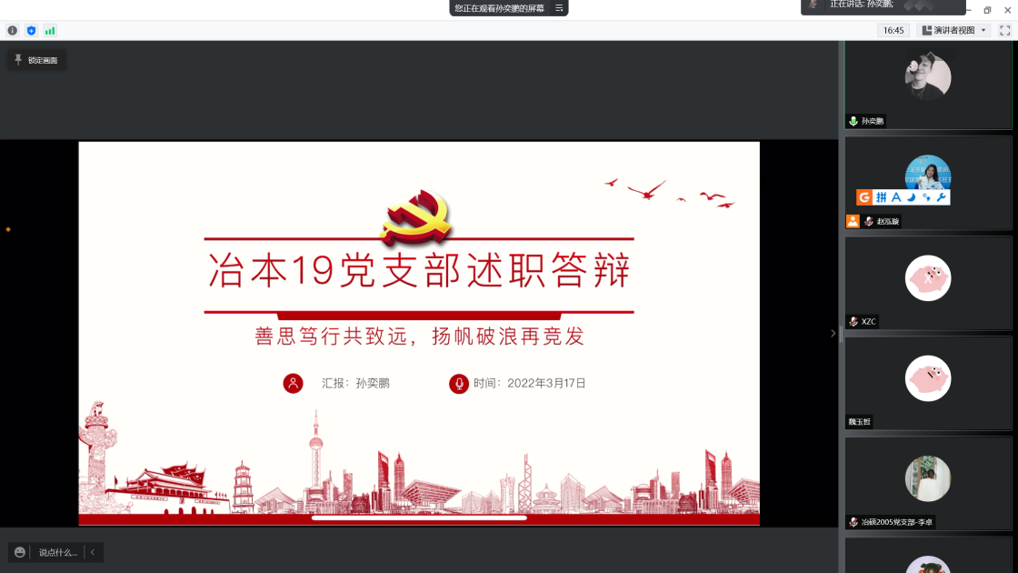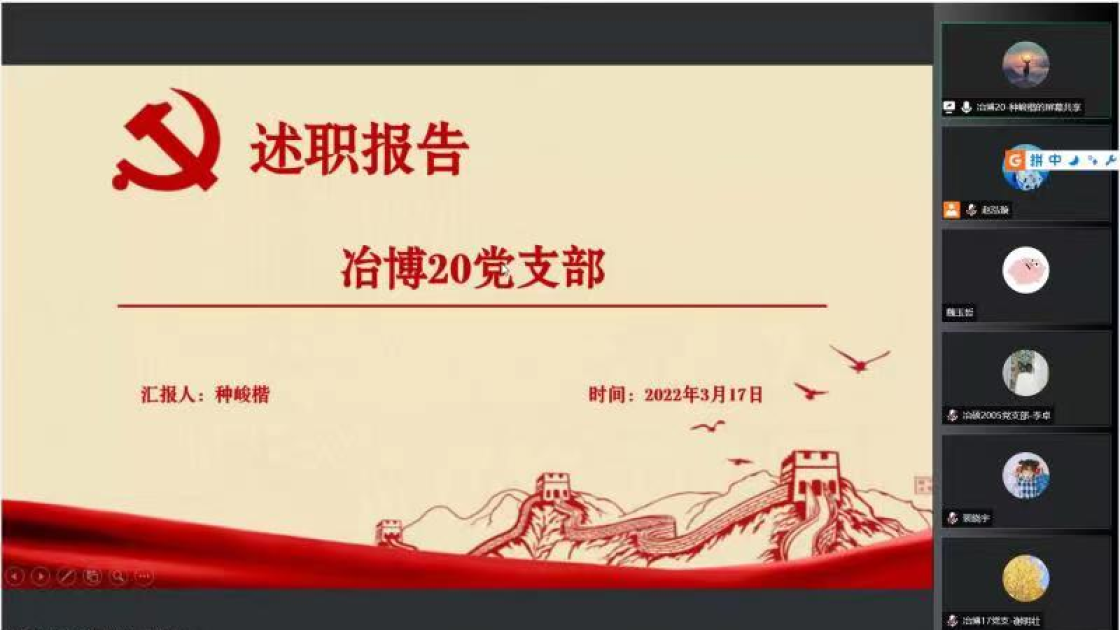 过去一年中,支部书记带动支部成员认真贯彻落实党的十九大和十九届六中全会精神,进一步深化拓展党史学习教育。会上,张建良对学生支部、支部书记在2021年的辛苦付出表示感谢,并进一步明确下一阶段的目标方向。接着,16名学生党支部书记先后就组织架构、制度建设、学风建设等方面对全年党支部工作做了总结汇报。2021年,成人文学 党委各学生党支部紧密围绕贯彻落实习近平总书记“七一”重要讲话精神和关于加强高校党建工作的重要论述,坚持以党的政治建设为统领,以打造高质量的基层党建工作体系为重点,不断提升基层党建工作的质量。各位党支书在述职报告中展示了责任与担当,突出了工作亮点与支部特色,也深刻剖析了目前存在的问题与不足,提出整改计划,明确努力方向。