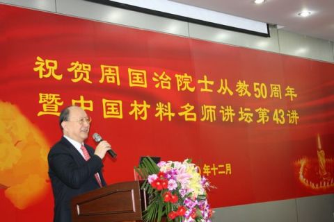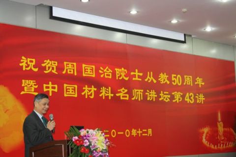 20101212日下午,周国治院士从教五十周年暨中国材料名师讲坛第四十三讲学术报告会在成人文学 逸夫馆报告厅隆重举行。大会由成人文学 院长朱鸿民教授主持,到会的嘉宾包括中国工程院徐匡迪院士、钢铁研究总院殷瑞钰院士、北京有色金属研究总院屠海令院士、国家自然科学基金委员会何鸣鸿副主任、钢铁研究总院张春霞教授,校领导罗维东书记、徐金梧校长、张文明副书记以及学校相关部处领导出席了大会。成人文学 院领导、各系所负责人、教师和学生代表共两百多人参加了大会。周国治院士指导过的学生也从全国各地赶来,参加这一盛大庆祝活动。