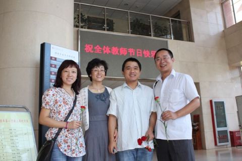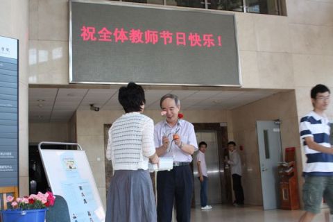 楼,为学院教师亲自送上教师节的问候与祝福,在学院楼一层大屏幕上显示着:祝愿全体教师节日快乐!大厅里摆放着五颜六色的鲜花康乃馨以及精美的小礼物,每当一位教师步入大厅,耿院长都亲自送上一支康乃馨和一份小礼物,感谢和笑声成为每个教师共同的语言,节日幸福灿烂的笑容洋溢在每位教师的脸上,也同时温暖着他们跳动的心房,吸引着旁边经过上课的同学及路人不时驻足观看,流露出羡慕的眼神。