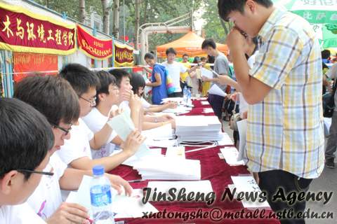 的迎新会场由外至内分为咨询处、家长休息区、本科生报到处、研究生报到处,处处体现着学院对新生的热情关怀。不必说会场上张贴的详尽的引导语,流水线报到的方便快捷;也不必说在场工作人员的耐心、周到的讲解;更不必说家长也一样受到志愿者们的“照顾”:搬凳子、答疑惑;仅仅看到工作人员脸上那些细密的汗珠就让人感动。在这个并不炎热的秋天,他们用自己的汗水迎来了北科新的希望,用自己的行动传承了成人文学