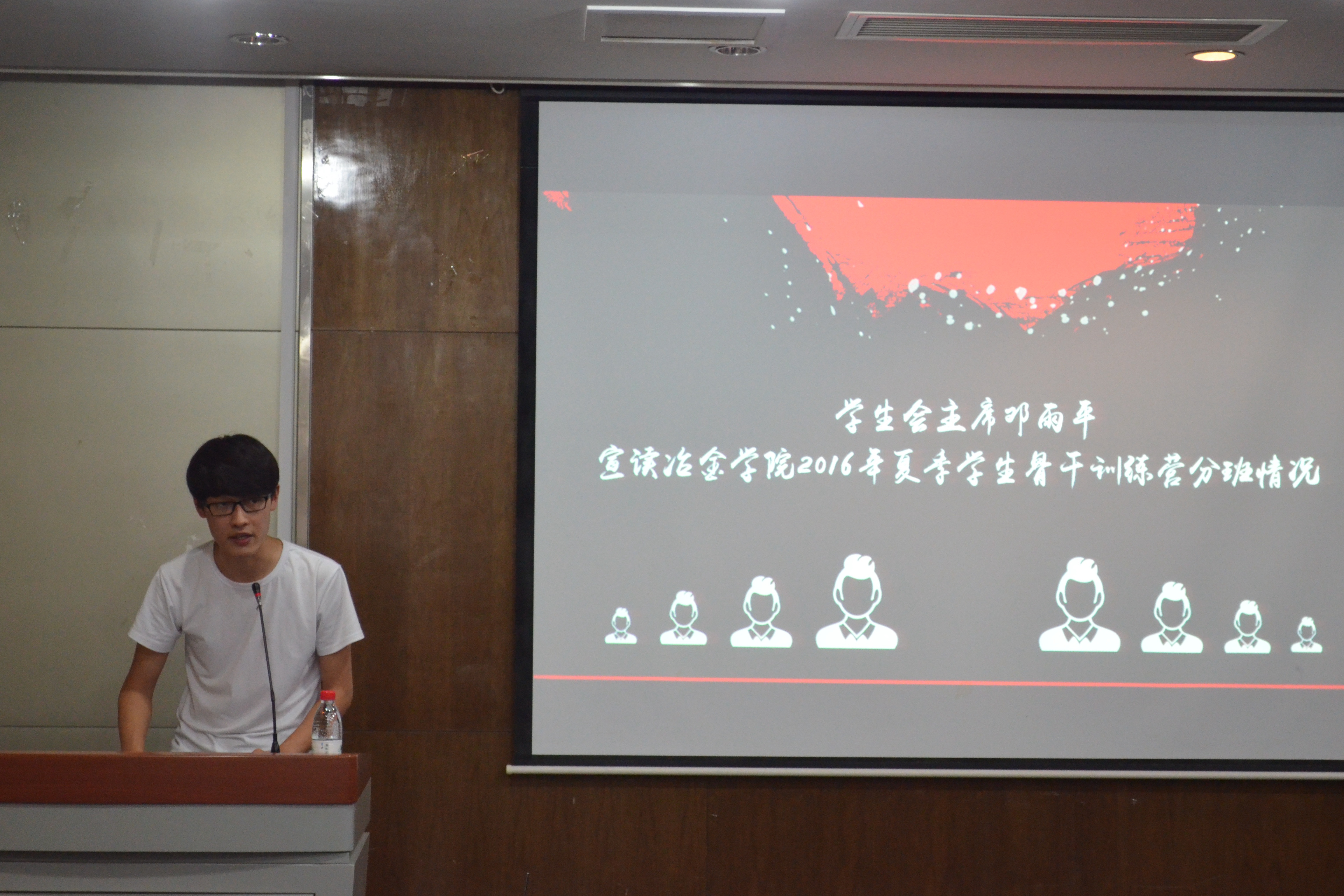 2016年夏季学生骨干训练营的通知并介绍了训练营的相关情况,随后学生会主席邓雨平同学宣读了成人文学