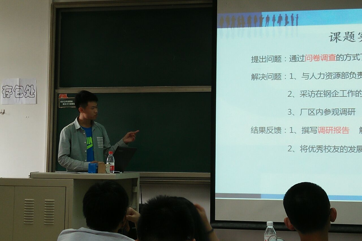 会议伊始,邓雨平以百分比的形式对社会实践的流程以及各阶段所占比重进行了简要分析,随后由本科14级优秀实践团队代表进行团队展示。栾益锋、马豪、马双飞和邓雨平四位同学分别结合各自团队的实际情况,在课题选择、前期准备、实践过程和成果转化等方面进行了详实细致的阐述和分享,对于实践过程中可能出现的一系列问题以及解决方案进行了综合解释。