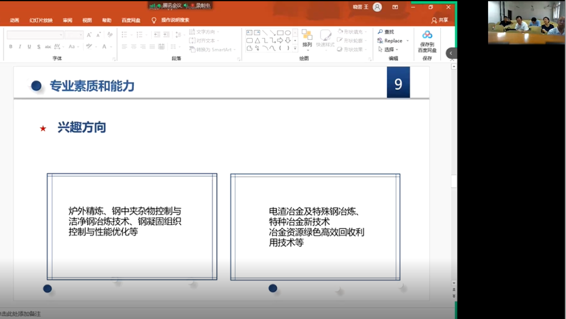钢铁冶金系主任张家泉、物理化学系主任闫柏军、有色金属冶金系书记曹战民、生态科学与工程系主任李素芹分别介绍了各系的历史和现状,着重阐述研究生的培养方案,以及冶金工程专业下各研究方向的发展优势。