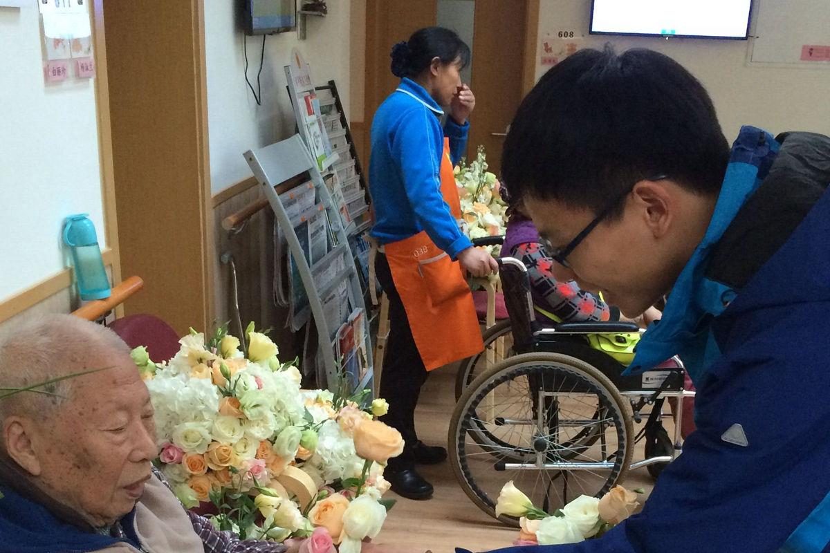 等到老人午休之后,同学们在工作人员的带领下进入房内,与老人进行互动。有的同学陪老人聊天,听他们以往的奋斗岁月;有的同学整理花朵,拿下来给老人们,看着他们那一张张满足的笑容;有的同学与老人探讨一些历史问题等等。在这时间段内,同学们了解到了该敬老院目前的养老状况、一些亟待解决的养老问题以及老人们对目前养老方式、服务机构、硬件设施和精神需求方面的意见和建议。快乐的时光总是短暂的,与老人会别后,志愿者回到学校。