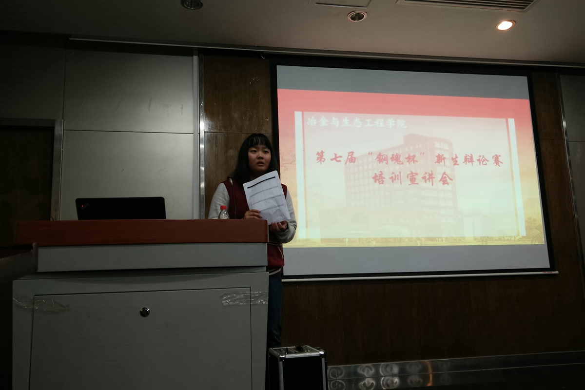 10月16日晚,成人文学 第七届“钢魂杯”新生辩论赛培训宣讲会在冶金楼青钢报告厅顺利召开。本次培训宣讲会由冶金1502班王甜雨同学主持,校立言辩论队队长樊婧同学、副队长张静远同学、程婉婷同学对参赛者进行了关于辩论赛的准备工作、辩论技巧和答辩礼仪等方面的培训。