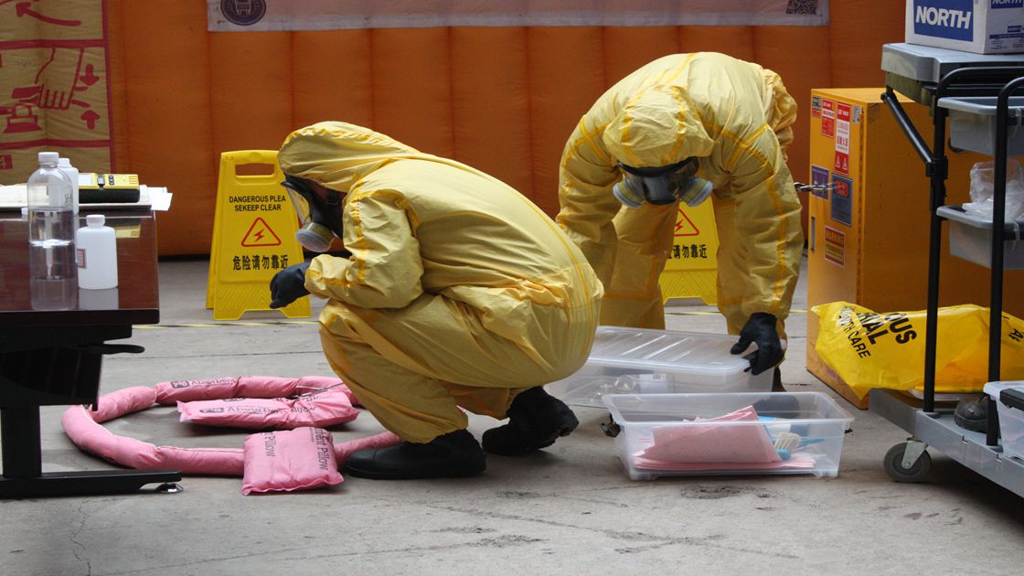 由资产管理处、保卫保密处和成人文学 党委共同主办的实验室危险化学品泄露应急演习在10:00准时开始,四名师生模拟了甲苯意外遗洒,实验室责任教师对实验人员进行疏散,对受伤学生进行急救,报告学院,保卫保密处前来进行有机溶剂泄漏紧急处置的过程。